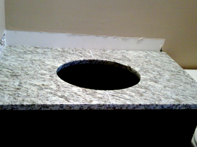 This granite is not the same as the granite in the kitchen. It's more striped and has a lot more brown/gray in it. As soon as the granite was installed, I could tell right away that the walls had to go. They looked entirely too gold against it. The question then became: what color should I paint the walls? I mean I knew it should be gray of some sort, but there are a million grays out there. Then I remembered that I had ordered a sample pot of Mouse's Back by Pratt & Lambert. I tested it out on the walls. In one word: perfection.
