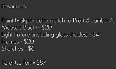 On Saturday I went to Lowe's to have P&L's Mouse's Back color matched into a Valspar paint. I did this because (1) Lowe's is closer than the guy who sells Pratt & Lambert paint and (2) Pratt & Lambert paint is more expensive than Valspar paint. While I was at Lowe's, I also picked up a new light fixture (way overdue although not as bad as my master bathroom lights. Just wait till you see those.)