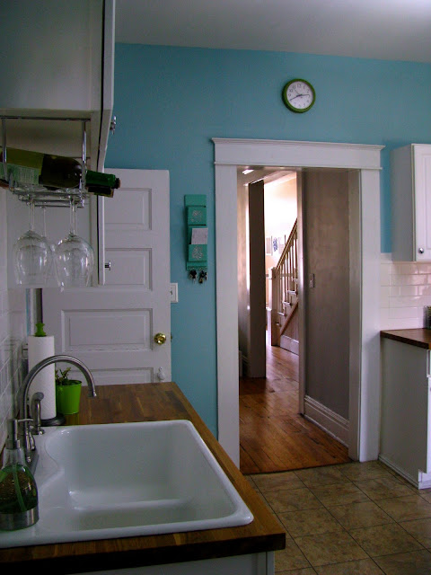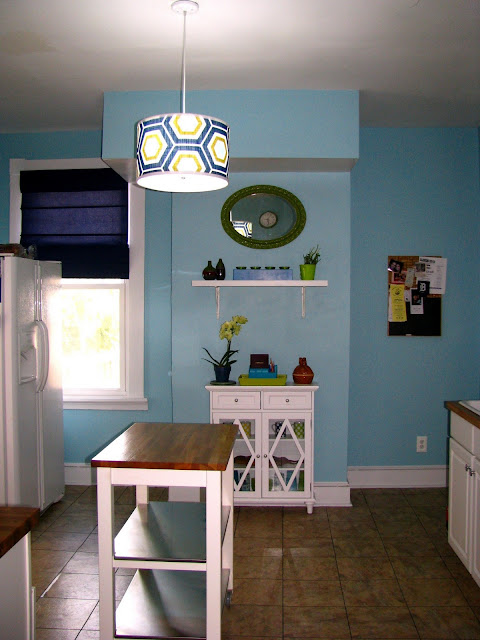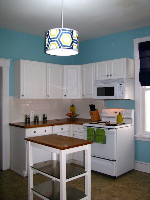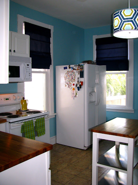 I love the rich new butcher block countertops, the pretty punch of fun in the drum shade chandelier, the pretty ocean blue and the old original charm. Beautiful job, Shannon. You two have worked so hard to make your home "yours" and I love watching the progress.